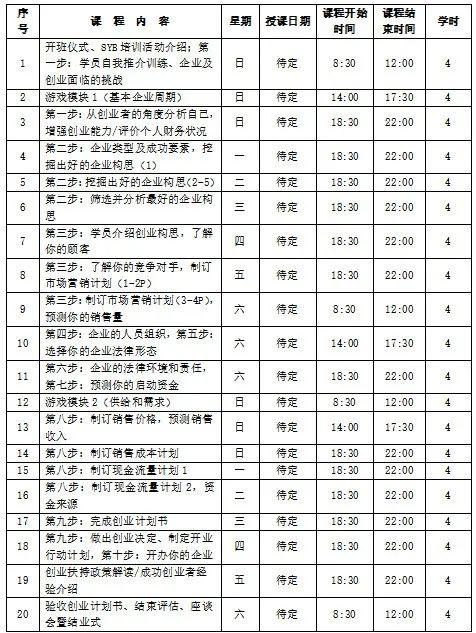 说明:根据广州市职业能力培训指导中心有关规定,SYB培训共80学时,学员出勤率不能低于90%,否则该学员结果验收不予通过,且不予发放SYB创业培训合格证书。