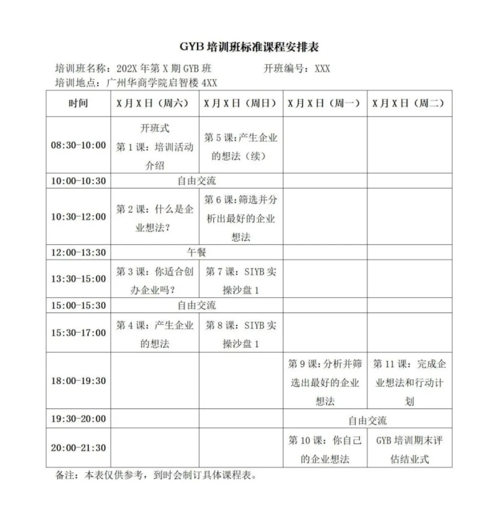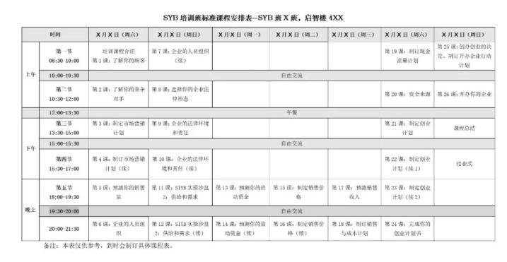 1、第一阶段的GYB创业培训集中一周内的周一至周五晚上、周末白天上课,第二阶段的SYB创业培训集中两周内的周一至周五晚上、周末白天及晚上上课,具体时间以后另行通知。