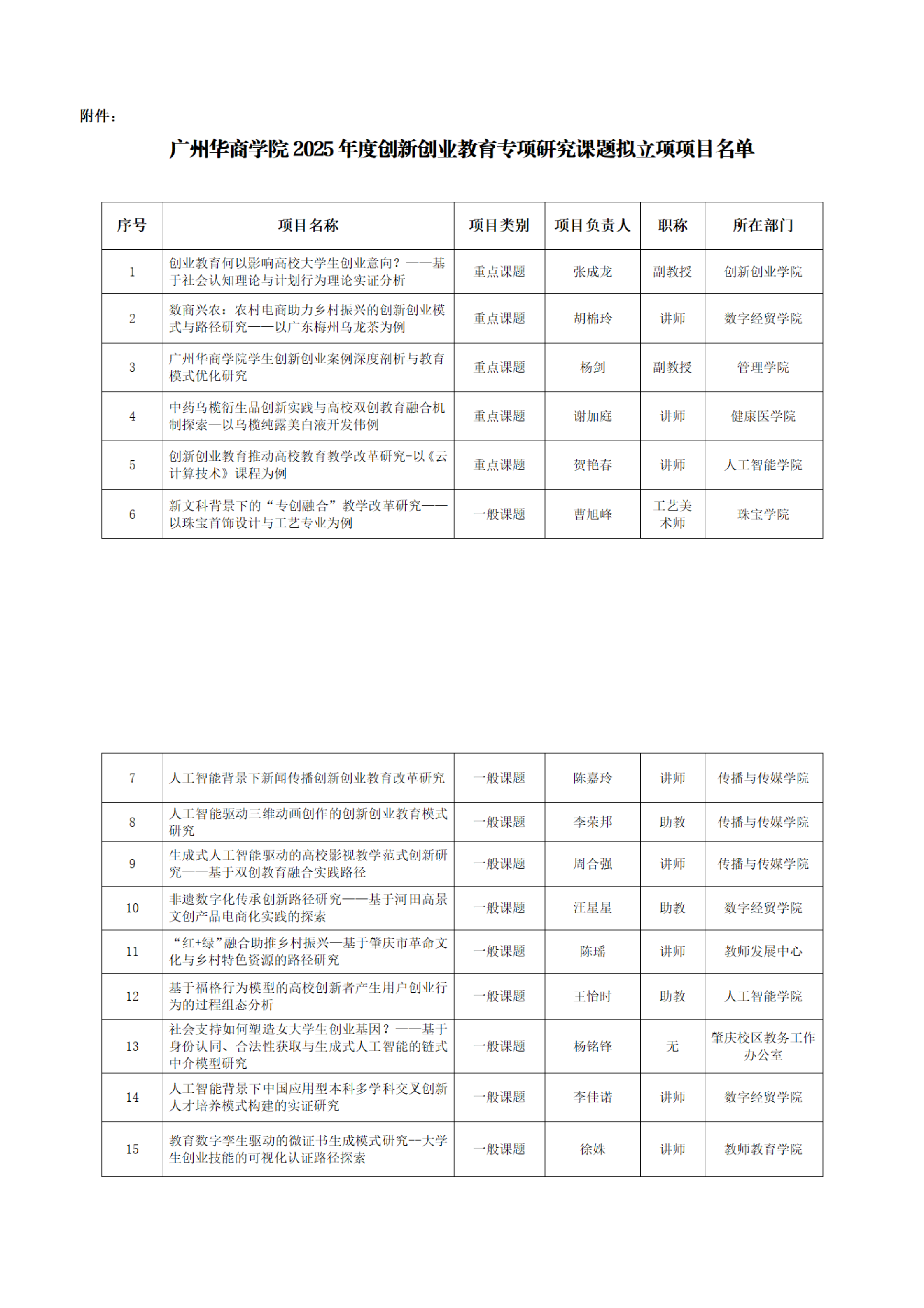 附件:广州华商学院2025年度创新创业教育专项研究课题拟立项项目名单