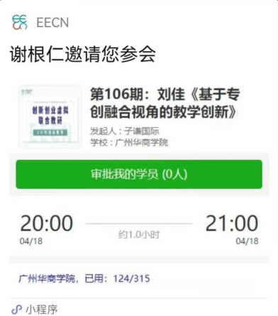 为进一步落实学校创新创业教育改革相关政策,依据本科教学评估指标要求,进一步探索专创融合教学改革路径,我院(中心)联合中国创业教育工作者网络(EECN),在本学年每周为学校不同专业教师安排一次专创融合教学培训活动,培训采用在线虚拟教研室的形式开展,培训时间为每周四晚20点(偶尔有调整)。希望各位老师积极报名参加,并在培训活动后发送一张观看讲座视频的照片、一张讲座界面截图到邮箱xiegenren@163.com。