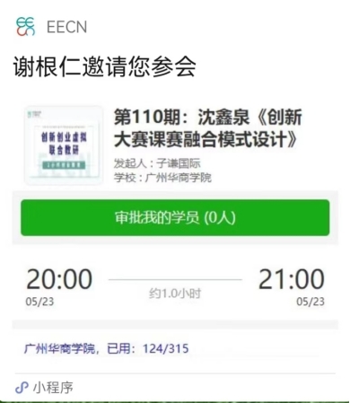 为进一步落实学校创新创业教育改革相关政策,依据本科教学评估指标要求,进一步探索专创融合教学改革路径,我院(中心)联合中国创业教育工作者网络(EECN),在本学年每周为学校不同专业教师安排一次专创融合教学培训活动,培训采用在线虚拟教研室的形式开展,培训时间为每周四晚20点(偶尔有调整)。希望各位老师积极报名参加,并在培训活动后发送一张观看讲座视频的照片、一张讲座界面截图到邮箱xiegenren@163.com。