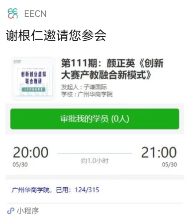 为进一步落实学校创新创业教育改革相关政策,依据本科教学评估指标要求,进一步探索专创融合教学改革路径,我院(中心)联合中国创业教育工作者网络(EECN),在本学年每周为学校不同专业教师安排一次专创融合教学培训活动,培训采用在线虚拟教研室的形式开展,培训时间为每周四晚20点(偶尔有调整)。希望各位老师积极报名参加,并在培训活动后发送一张观看讲座视频的照片、一张讲座界面截图到邮箱xiegenren@163.com。