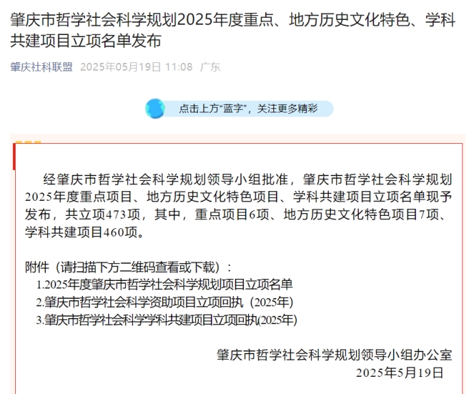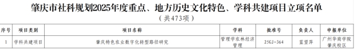 根据《肇庆市哲学社会科学规划2025年度重点、地方历史文化特色、学科共建项目立项名单》通知,我院蓝望萍老师主持的《肇庆特色农业数字化转型路径研究》项目获批肇庆市哲学社会科学规划2025年度学科共建项目立项。