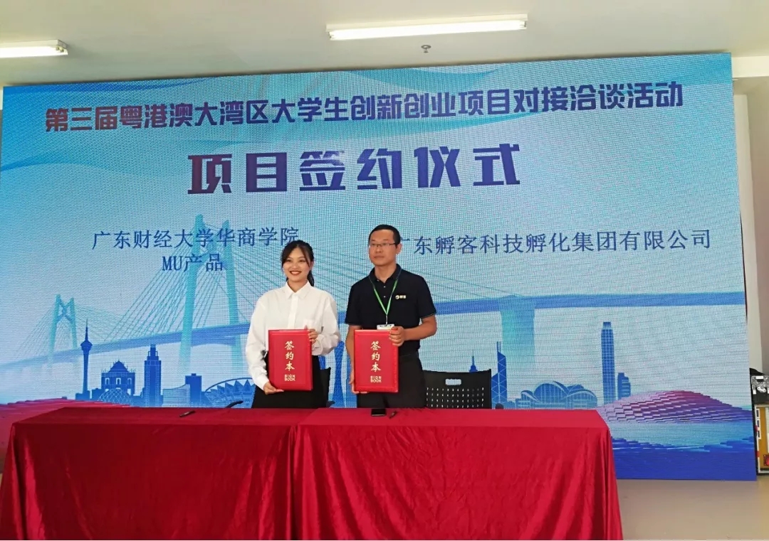 MU(My University)APP项目和互联网+稻印服装定制项目2个项目团队获得项目现场路演展示机会,经过项目展示、评委提问和问题对答等环节后脱颖而出,最后,互联网+稻印服装定制团队成功与佛山市怀集商会签约,MU(My University)APP产品团队成功与广东孵客科技孵化集团有限公司签约。
