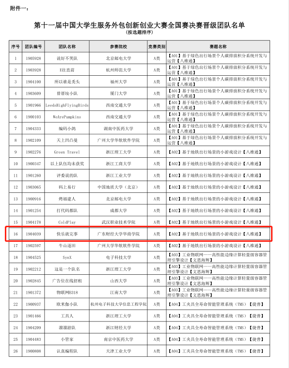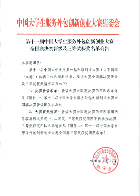 近日,第十一届中国大学生服务外包创新创业大赛组委会公布全国赛决赛晋级及三等奖获奖名单公告,我校有两支队伍再创佳绩,“快乐就完事”成功晋级全国总决赛角逐一、二等奖, “今晚不熬夜1”队获得全国赛三等奖。