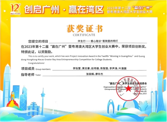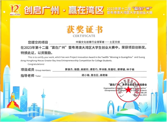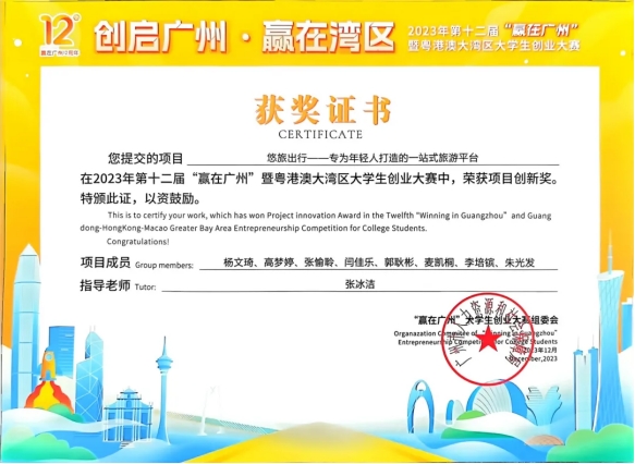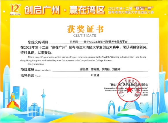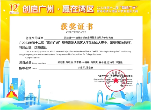 由广东省人力资源和社会保障厅、广东省教育厅指导,广州市人力资源和社会保障局主办,广州市人力资源市场服务中心(广州市高校毕业生就业指导中心)承办的2023年第十二届“赢在广州”暨粤港澳大湾区大学生创业大赛已圆满落幕,广州华商学院《乐养网——基于AIGC的新时代智慧养老服务平台》《伴生行——爱心陪诊,医院里的明灯》《笑脸通——情绪分析安全预警系统助力乡村教育》《中国文化创意行业领军者——土豆文创》《悠旅出行——专为年轻人打造的一站式旅游平台》5个项目均荣获“项目创新奖”,我校荣获“优秀组织奖”。