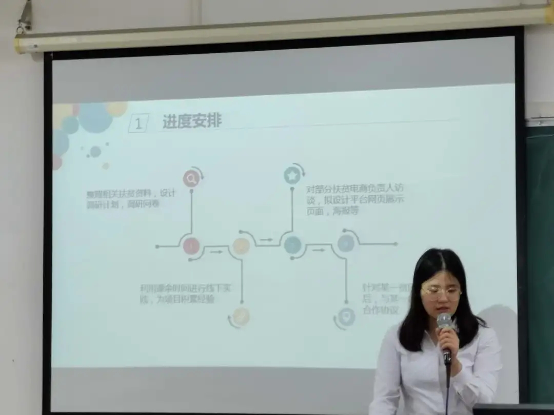 汇报人答辩称受疫情影响项目进展缓慢,营业执照未审批下来导致线上商城还未投入使用,并表示会虚心采纳教授的建议,继续把项目做得更完善。