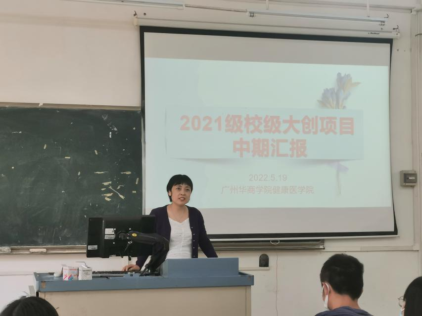 青年创未来,青春展风采。为了解和考察本院2021级大学生创新创业训练计划项目(以下简称为“大创项目”),团队的项目进度和已取得成果,对各项目后期的开展提出意见和建议,引导成员们总结项目进程中遇到的问题。2022年5月19日14点30分,广州华商学院健康医学院在励志楼D103举行2021级校级大创项目中期考核汇报。
