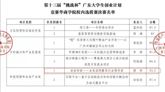荣获第十三届“挑战杯”广东省大学生创业计划竞赛校级选拔赛第一名