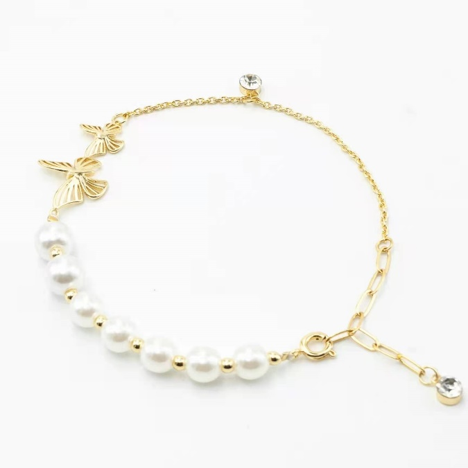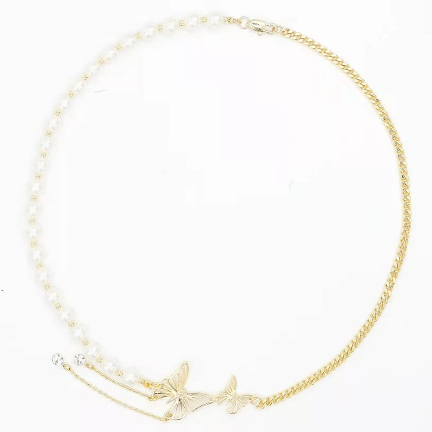 优雅重生蝶,翩跹金翅开,暗喻破茧重生的力量。细金链加珍珠的拼接,衬得肤色亮白;翅底细链自然垂荡,更显灵动。