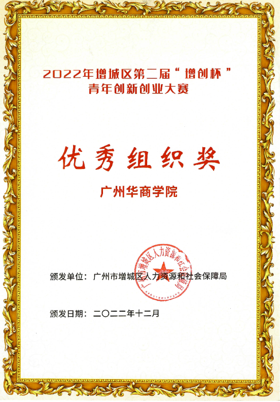 2022年增城区第二届“增创怀”青年创新创业大赛优秀组织奖(广州华商学院)