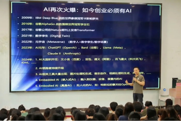 随后,彭教授借助AI技术在生活中的应用实例,提出了“AI再次爆火,如今创业必须要有AI”,并强调创新不仅仅是技术创新,还包括理论创新、产品创新和模式创新。彭教授从市场调研、技术方案、团队建设、融资等多方面为学生展开分析创业所需的前期准备工作,鼓励在场学生善于使用AI和数字科技,提升自身的综合素养,以适应未来职业市场的需求。