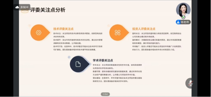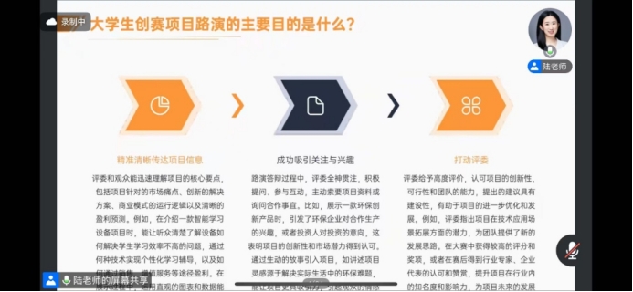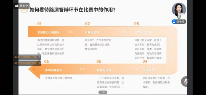 陆娉老师以"结构化叙事框架构建"为切入点,系统拆解了路演呈现的核心方法论:通过"痛点场景-方案拆解-价值延展"三幕剧模板搭建逻辑骨架,结合评委决策链的"技术壁垒-商业模式-团队基因"三重价值感知规律,精准锚定路演内容的价值输出点。她创新性提出路演能力进阶的"陈述精准度-论证穿透力-价值共鸣感"三级跃迁模型,并针对"技术堆砌型表述""数据孤岛化论证"等五大常见答辩风险防控矩阵展开深度解析。